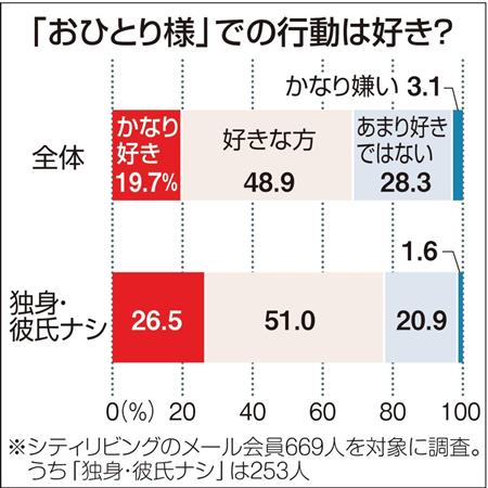 働く女性のための情報紙「シティリビング」が調査したアンケートでは、おひとり様での行動について「好き」と約7割が回答。独身で彼氏がいないOLでは約8割に上りました。